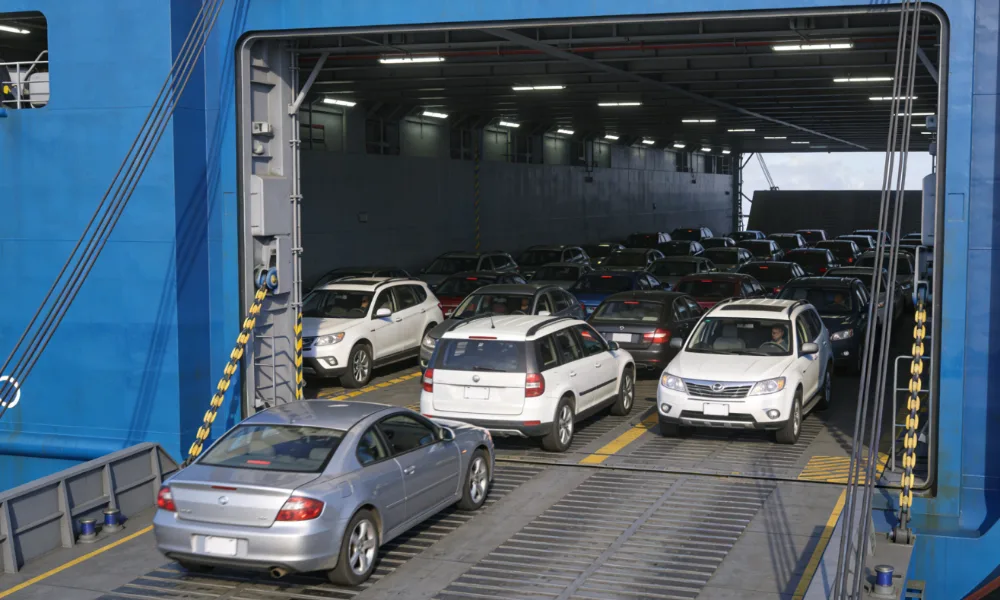 Vehicles are transported to the designated port for loading